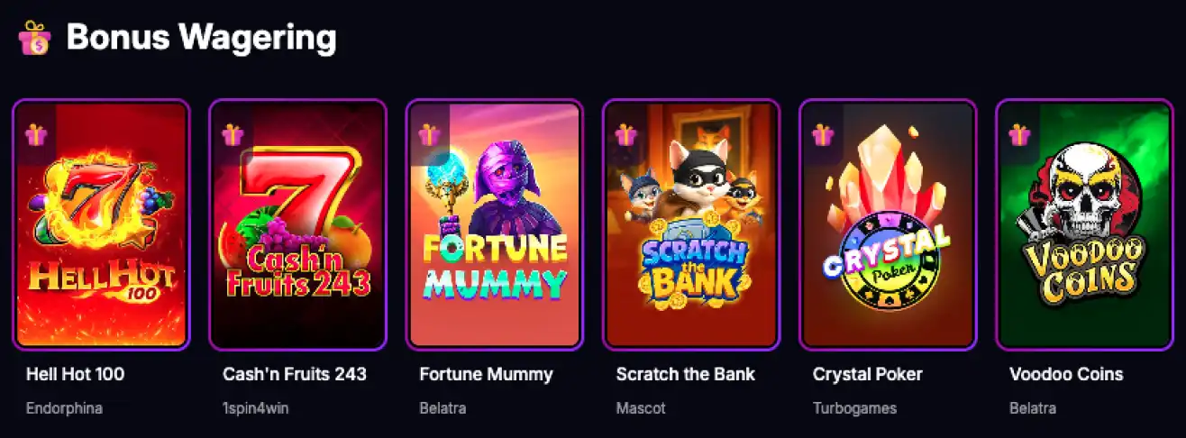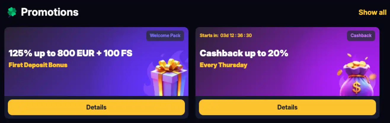 Iedere maandag krijgen spelers tot 10% cashback op hun verliezen van de voorgaande week. Deze bonus wordt automatisch toegekend aan accounts met een geverifieerd profiel en is inzetvrij. Cashback kan worden gebruikt op alle casinospellen, inclusief live games en slots, zonder beperkingen.