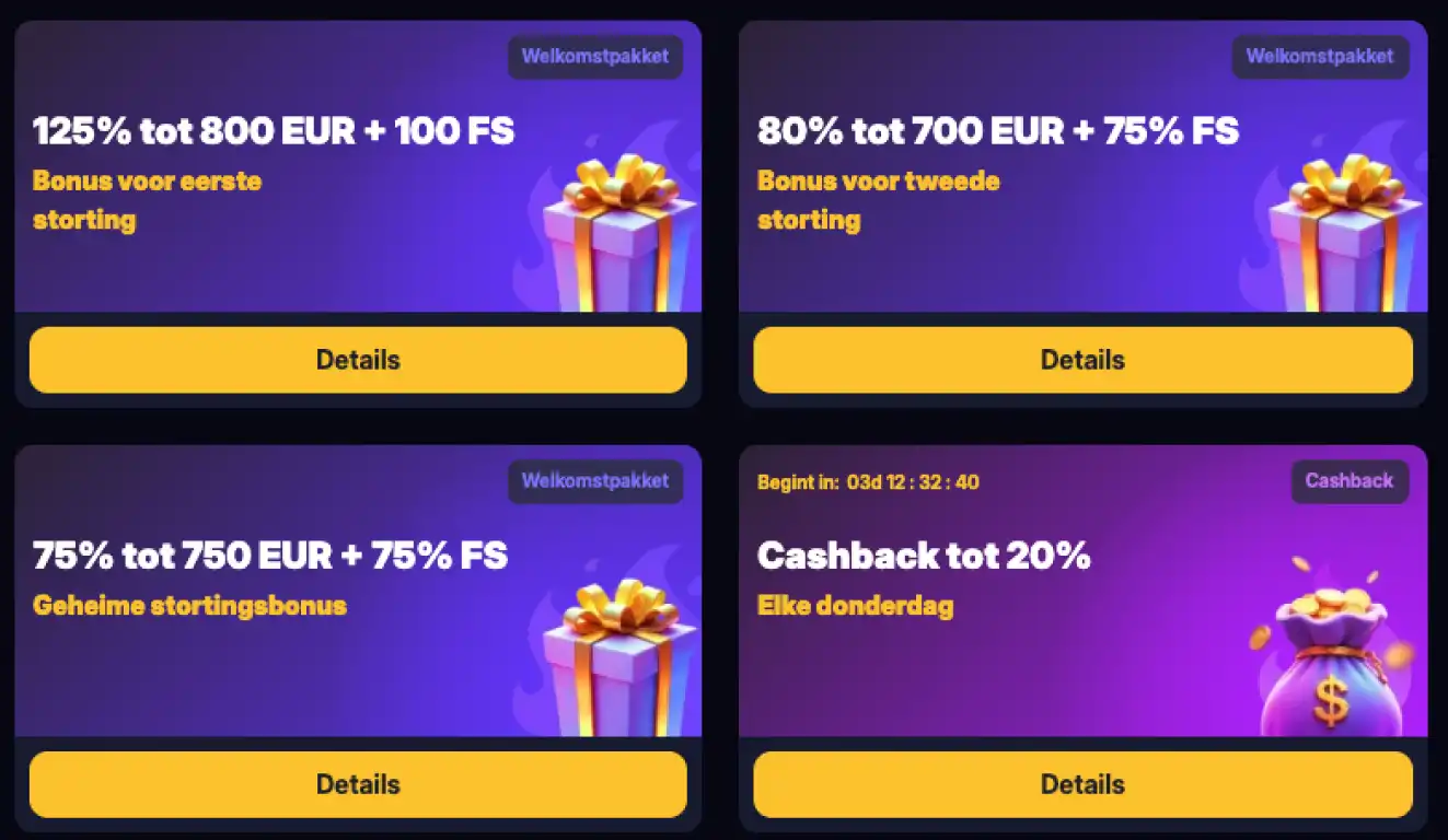 Terugkerende spelers kunnen profiteren van een wekelijkse herlaadbonus van 50% tot €250 bij elke storting op vrijdag. Deze actie is ideaal voor spelers die hun weekend willen beginnen met extra speeltegoed. De bonus wordt direct toegevoegd aan je saldo en heeft een 30x inzetvereiste.